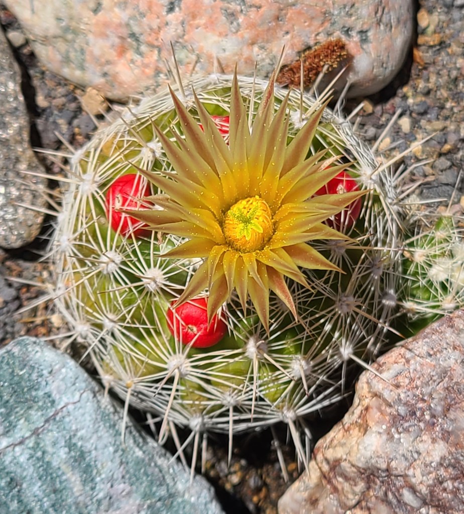 The Missouri Foxtail is named after the Missouri territory in the 1800s. In general this species grows from Canada to Mexico and from Texas to Arizona. This species is one of the most cold hardy species of cactus. These plants are squat plants that can get many offsets and get quite large. They often retract in winter to be almost flush with the ground but quickly rebound and plump up in the spring. Bright yellow flowers will fade to oranges or peaches. Red fruits add to the interest. Zone 4-7