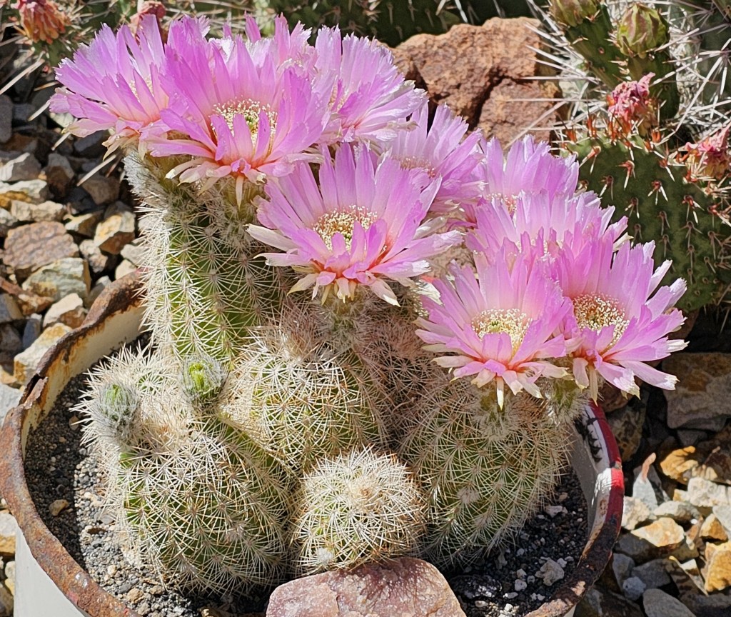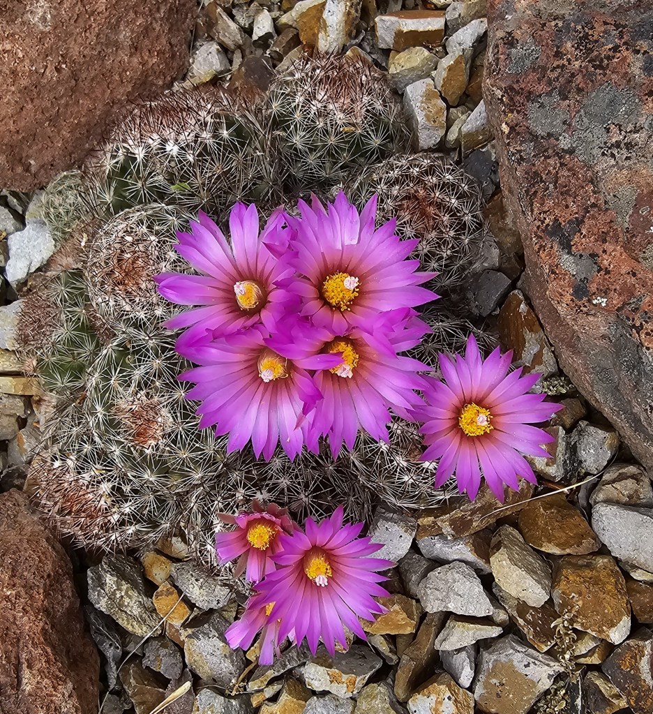 Attractive multi-stemmed plant with multicolored spines both short and long. Flowers of rich magenta. Originally found in southeastern Arizona and into southwest New Mexico. Zone 5-7